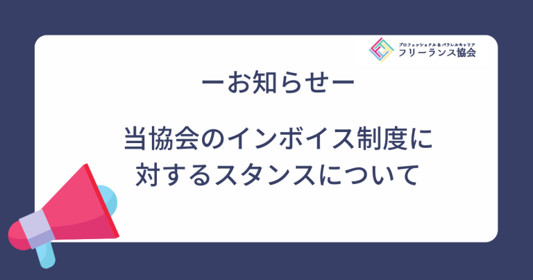 フリーランス協会の事務局は、フリーランスの当事者集団です。 事務局内だけでも多様な意見があるように、決してフリーランスの総意というものがあるとは思いませんが、私たちはこれまで、新型コロナ、契約トラブル、社会保険、ハラスメントなど、フリーラン … 続きを読む 私たちは、インボイス制度導入による不利益防止のため戦い続けます