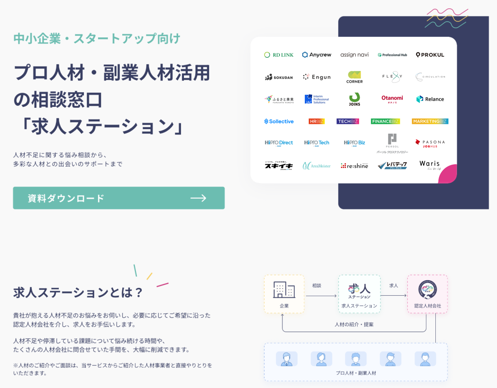 求人ステーションは、フリーランス(プロ人材・副業人材)に仕事を依頼したい企業向けの求人相談窓口で、業務委託契約やフリーランスの生態に詳しいコンシェルジュが、課題の整理と業務委託契約に向けた人材要件定義を無料でお手伝いした後、連携する認定人材会社の中から案件にフィットする会社を選定し、一括求人を出すというサービスです。