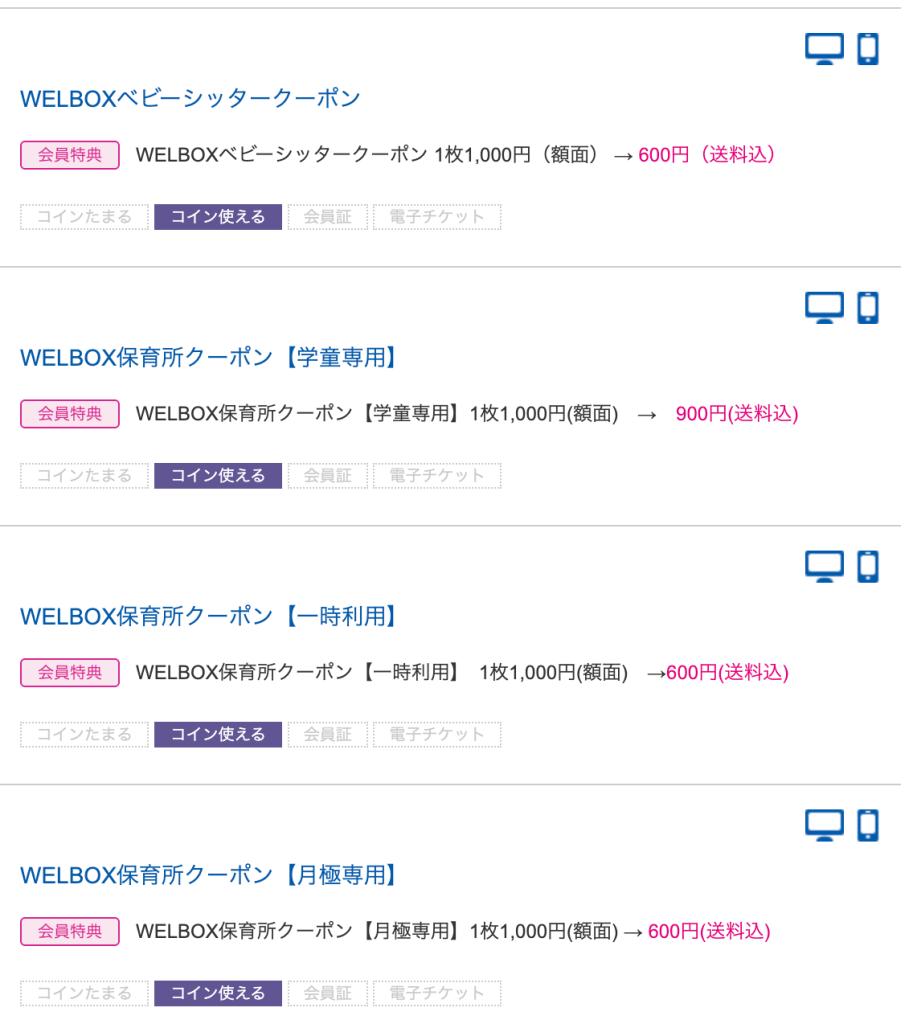WELBOXの育児クーポン(ベビーシッター、保育所、学童)と、