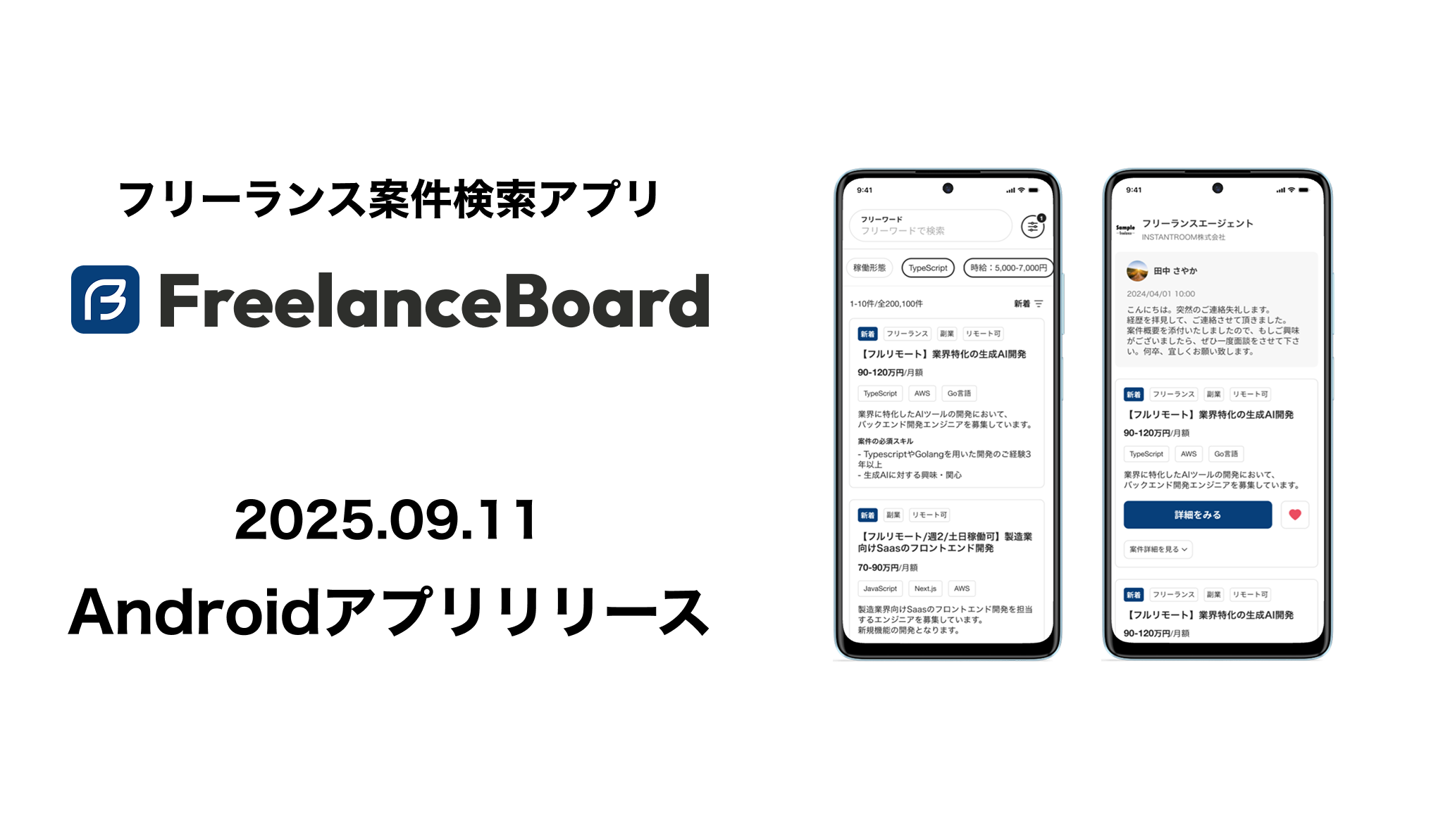 INSTANTROOM社運営の案件検索サイト「フリーランスボード」がAndroidアプリをリリース。iOS版に続き、フリーランス向け案件サイトで国内唯一の両OS対応を実現しました。