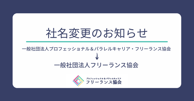 一般社団法人プロフェッショナル&パラレルキャリア・フリーランス協会 (東京都中央区、代表理事:平田麻莉、以下「フリーランス協会」)は、2025年11月1日付で登記上の団体名を「一般社団法人フリーランス協会」へ変更いたします。また、社名変更に … 続きを読む 【社名変更のお知らせ】2025年11月より「一般社団法人フリーランス協会」へ