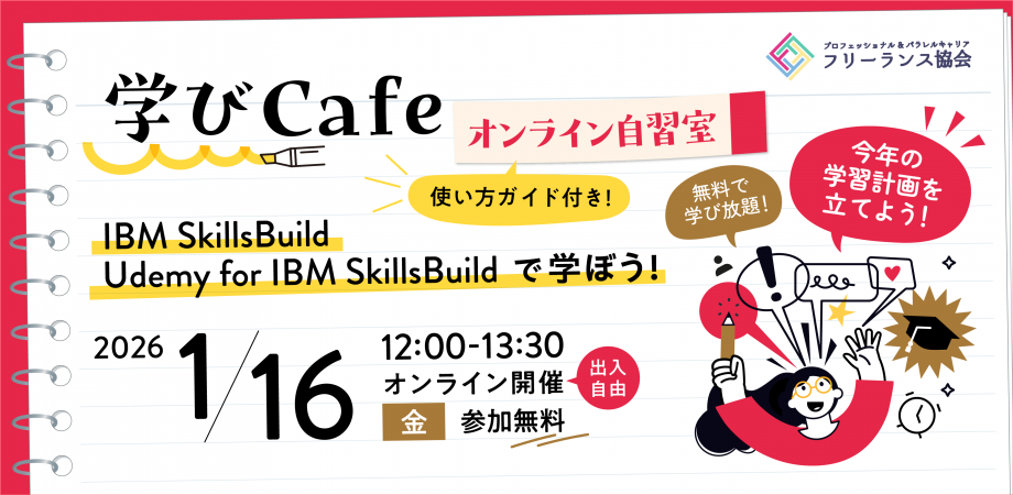 フリーランス協会の18歳以上のすべての会員(無料・一般)なら無料で学び放題のオンライン学習プログラム「IBM SkillsBuild」と「Udemy for IBM SkillsBuild」を活用し、学びを共有していくプロジェクトです。フリパラ(フリーランス協会公式note)では「学びCafe日誌」と題して活用法を連載し、不定期でイベントを実施しています。