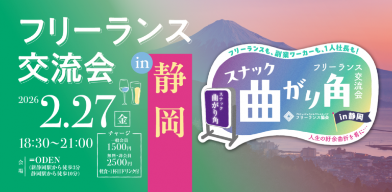 \フリーランスも、副業ワーカーも、一人社長も/ 「フリーランス仲間と情報交換したい!」「横のつながりを作りたい!」そんな皆さんからのお声をいただき全国各地で出張出店中の、フリーランスによるフリーランスのための交流会「スナック曲がり角」。 次 … 続きを読む 【2/27(金)】フリーランス交流会「スナック曲がり角」 in 静岡
