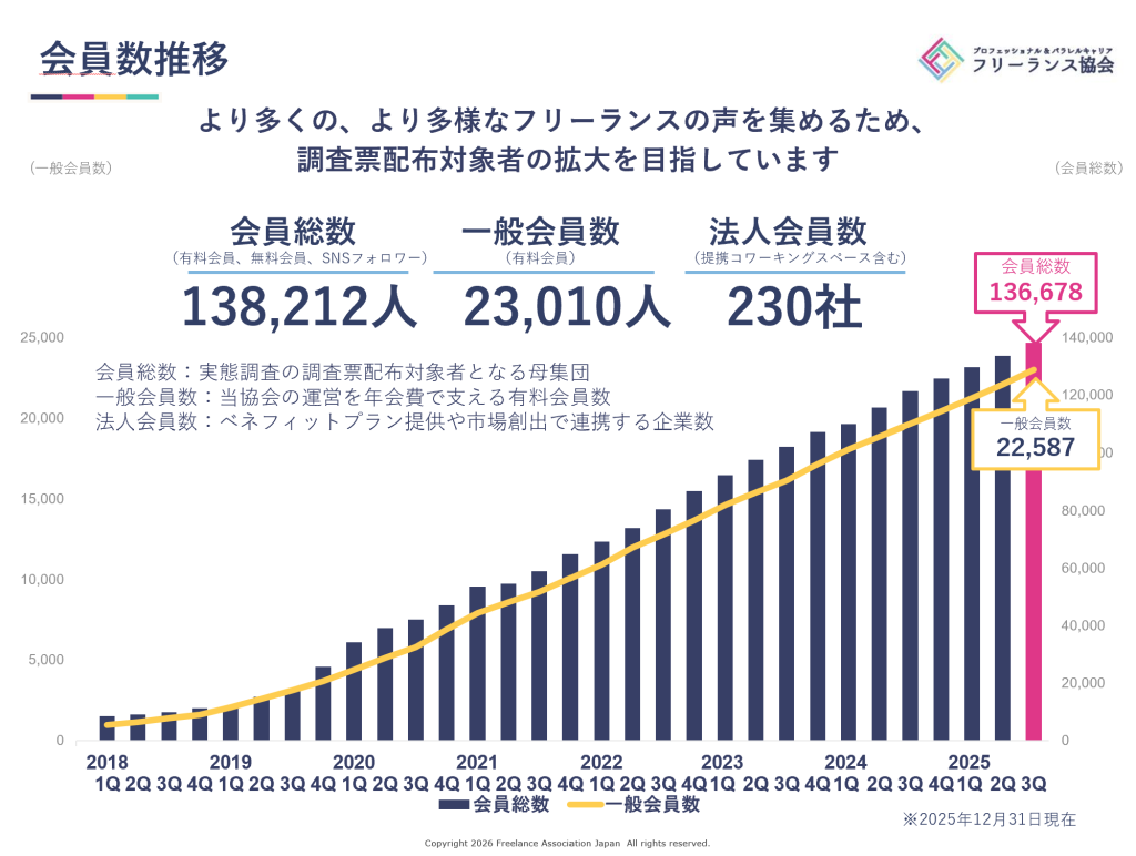 フリーランス協会では、より多くの、より多様なフリーランスの声を集めるため、調査票配布対象者となる会員数の拡大を目指しています。