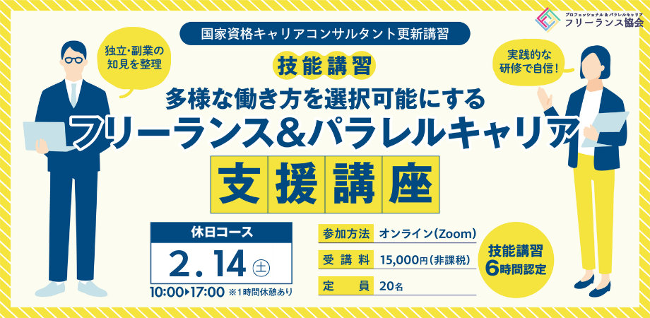 キャリアコンサルタントの国家資格保者が5年毎に受講する更新講習として、「多様な働き方を選択可能にするフリーランス&パラレルキャリア支援講座」を開講しました。(技能講習6時間分)