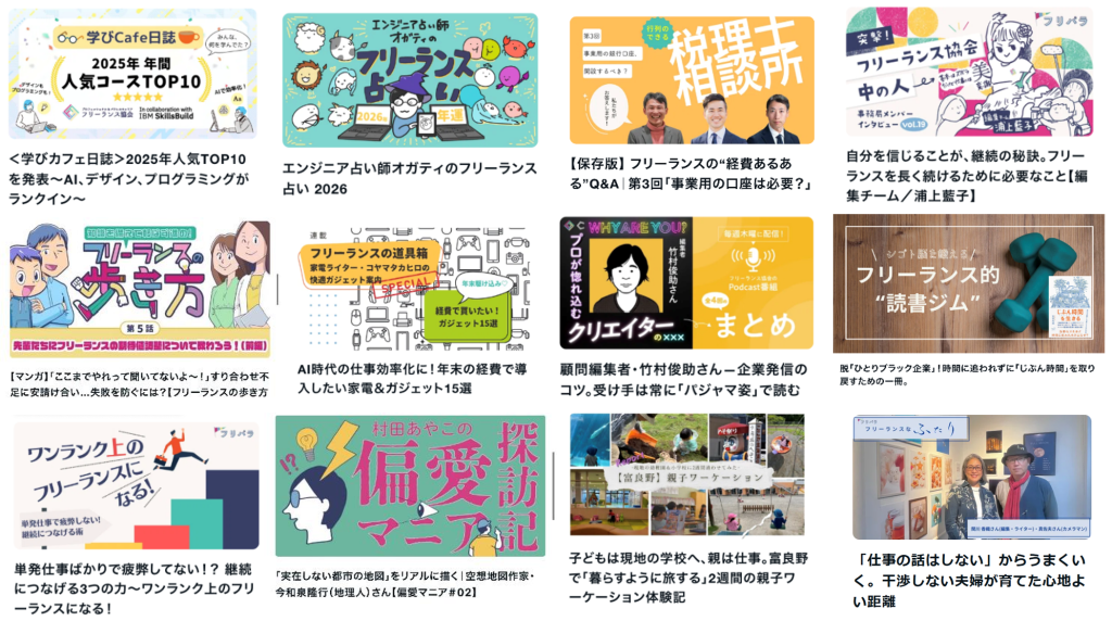 noteで運営しているオウンドメディア『フリパラ』も、フリーランスの基礎力を高める漫画、ワンランク上の活躍を目指すノウハウ、人物インタビュー、税務・法務解説、書籍や映画のレビュー、占い、レシピ、健康、家族の話など、盛りだくさんにどんどん進化しています。