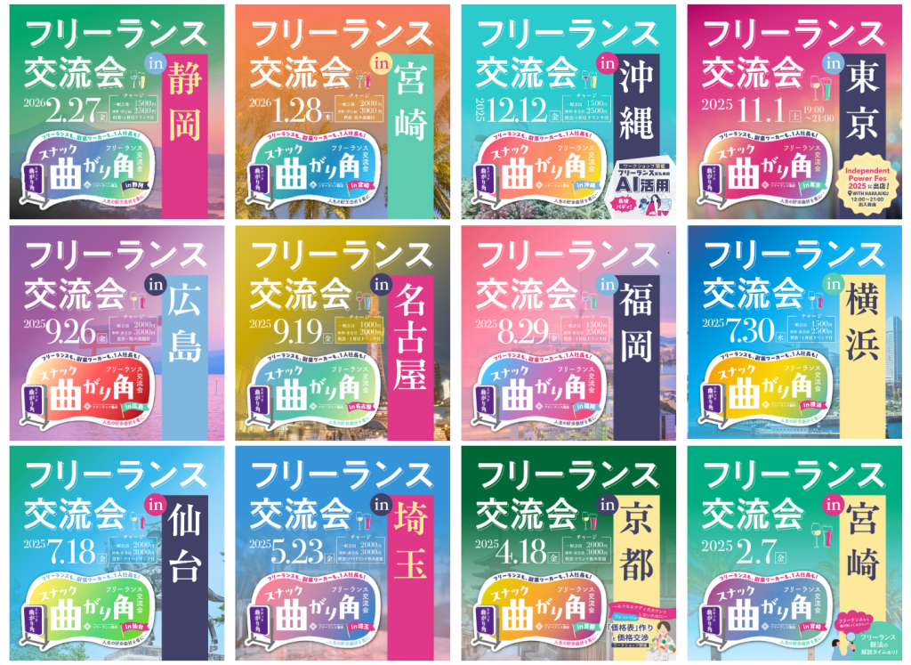 2025年度は、京都、埼玉、仙台、横浜、福岡、名古屋、広島、東京、沖縄でフリーランス交流会「スナック曲がり角」を開催してきました。どの地域も満員御礼で、皆さん大変賑やかに交流を楽しんでいただいています。
