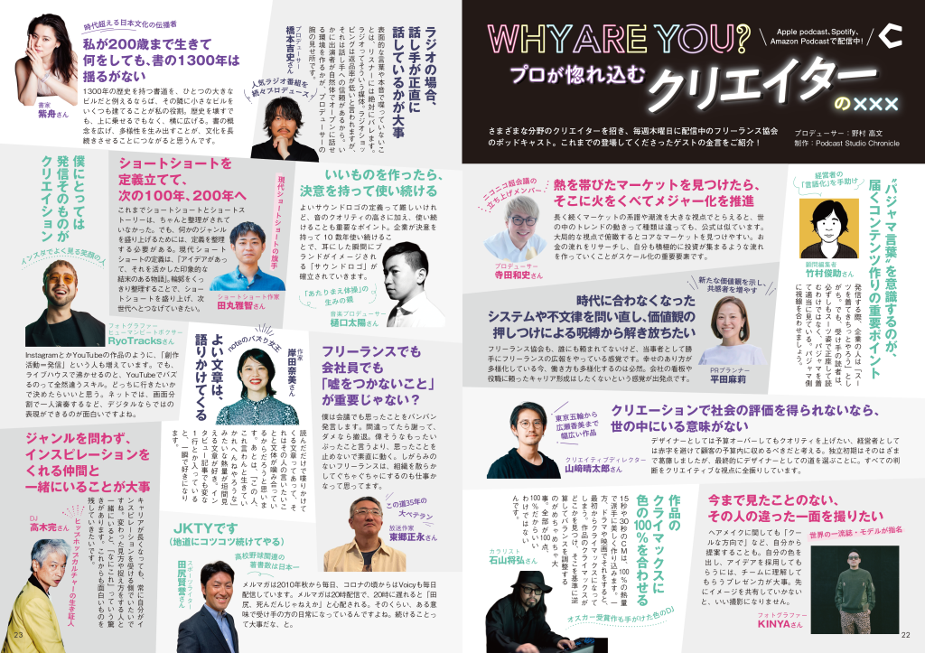 当協会代表の平田がクリエイティブディレクターの山崎晴太郎さんと一緒に、Spotify、Apple Podcast、Amazon Musicで毎週木曜にコツコツ配信しているPodcast『WHY ARE YOU? 〜プロが惚れ込むクリエイターのXXX〜』がおかげさまで1年を超えました。