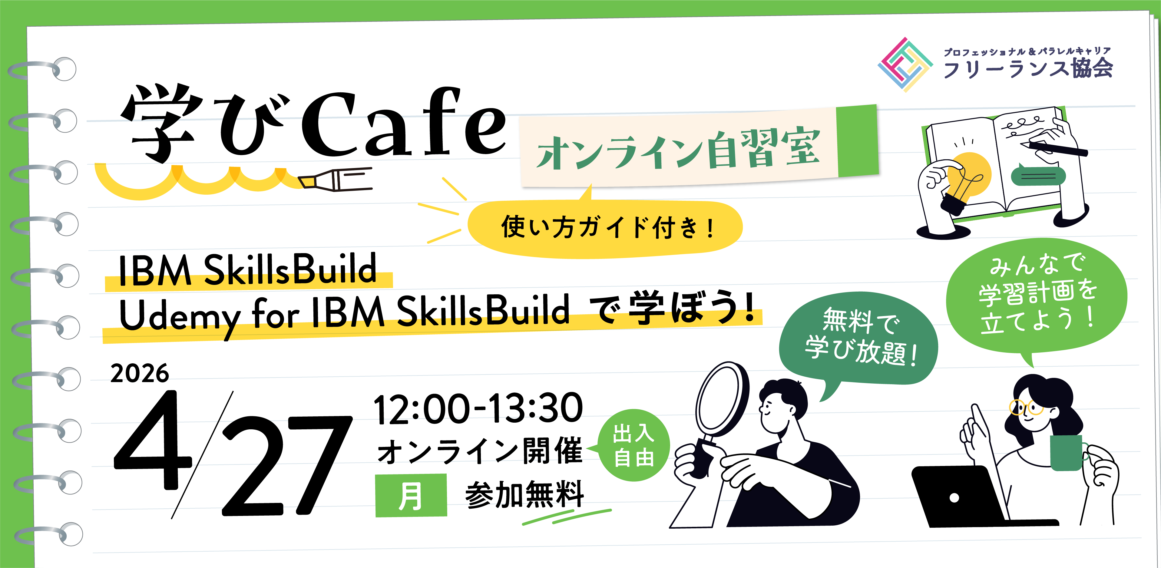開催時間中はオンラインへの出入自由。 冒頭では、フリーランス協会の18歳以上のすべての会員(無料・一般)なら無料で学び放題のオンライン学習プログラム「IBM SkillsBuild」と「Udemy for IBM SkillsBuild」でのコースの探し方や学習計画を立てるコツをお伝えします。